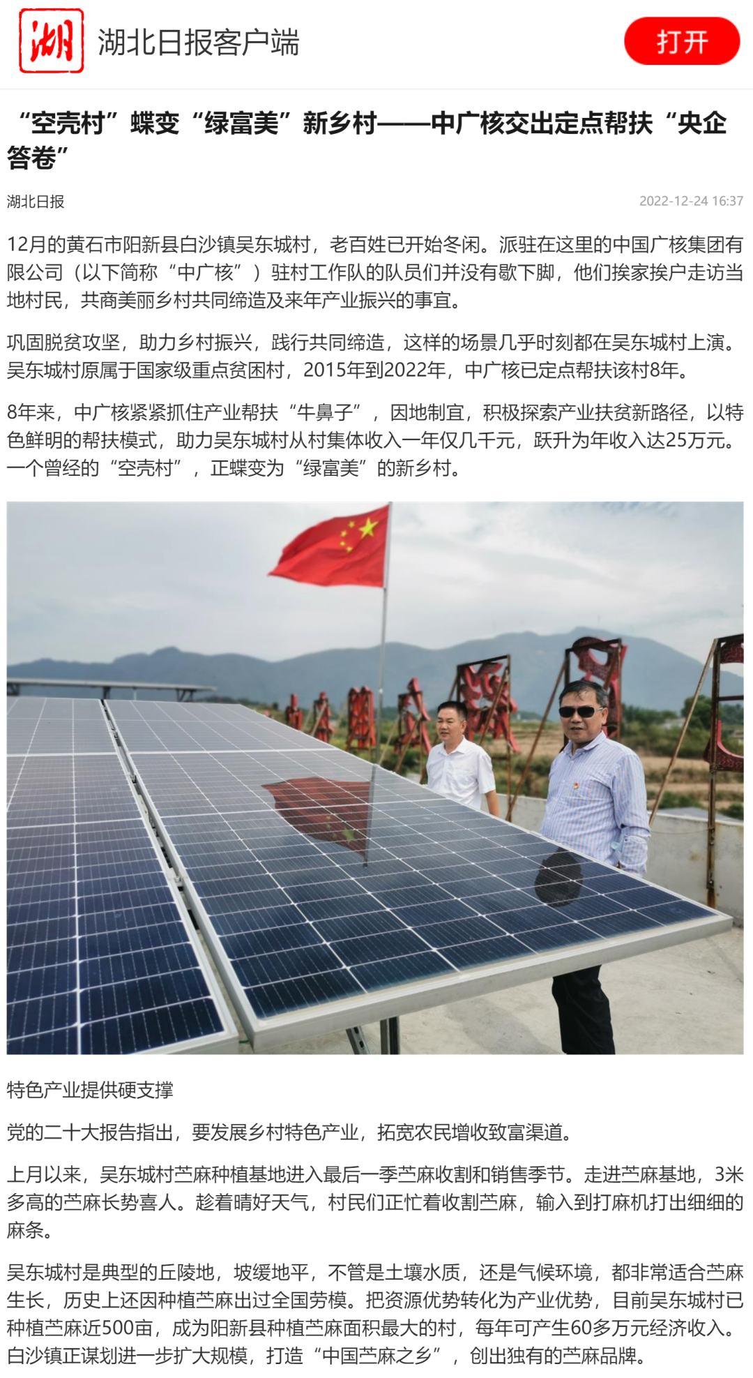 近日,湖北日報聚焦報道,中國廣核集團從2015年到2022年定點幫扶湖北省黃石市陽新縣白沙鎮吳東城村,積極探索產業扶貧新路徑,以特色鮮明的幫扶模式助力吳東城村脫貧攻堅,從“空殼村”變成“綠富美”新鄉村。