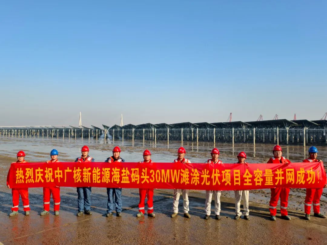 近日,中廣核海鹽碼頭灘涂光伏項目實現全容量并網。