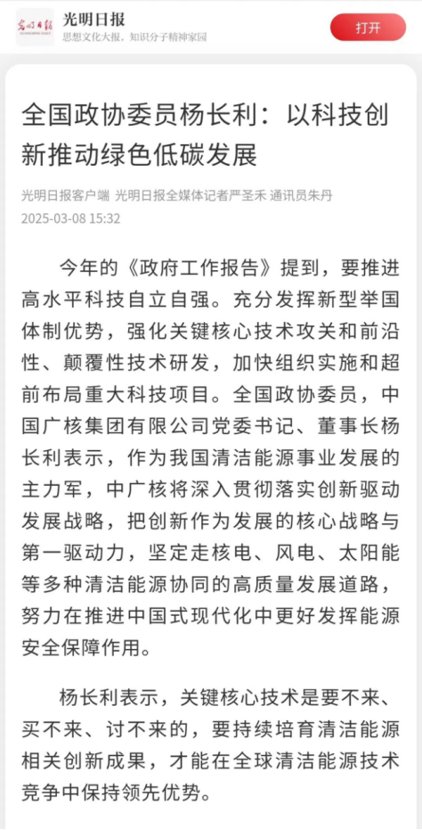 2025年全國兩會期間,全國政協(xié)委員、中國廣核集團有限公司黨委書記、董事長楊長利積極履職盡責(zé),圍繞科技創(chuàng)新、清潔能源融合發(fā)展以及人工智能技術(shù)應(yīng)用落地等熱點問題積極發(fā)聲,人民日報、新華社、中央廣播電視總臺新聞聯(lián)播、科技日報等多家媒體關(guān)注和報道,產(chǎn)生廣泛的社會影響。